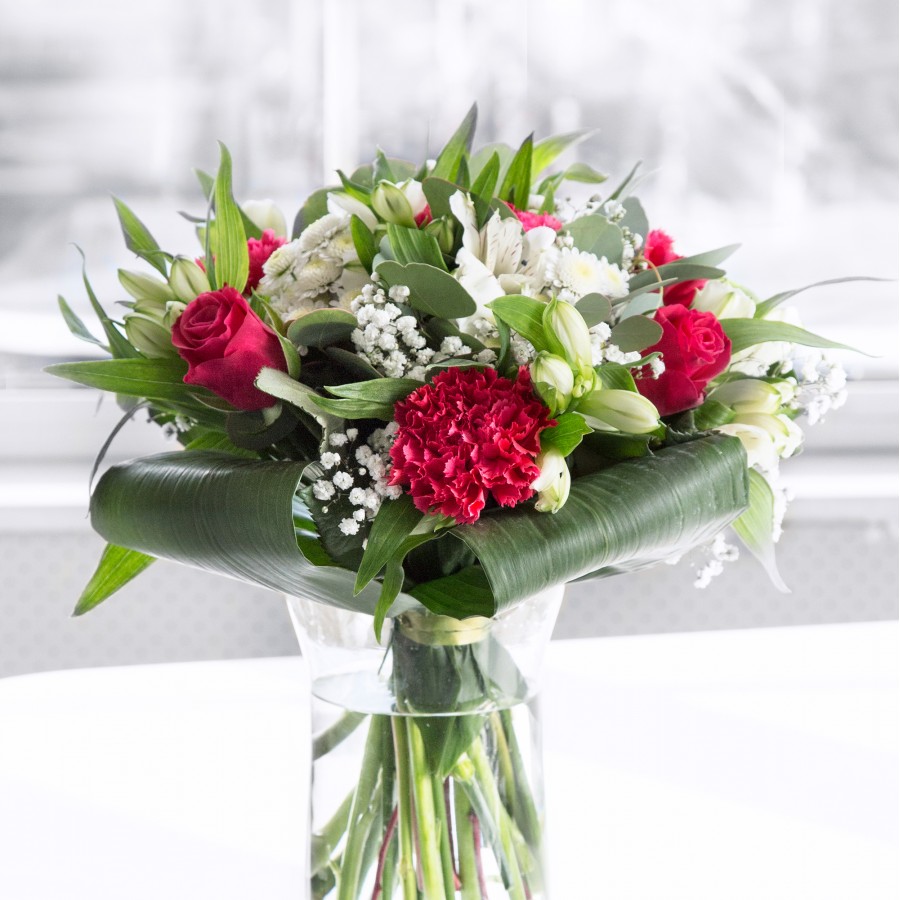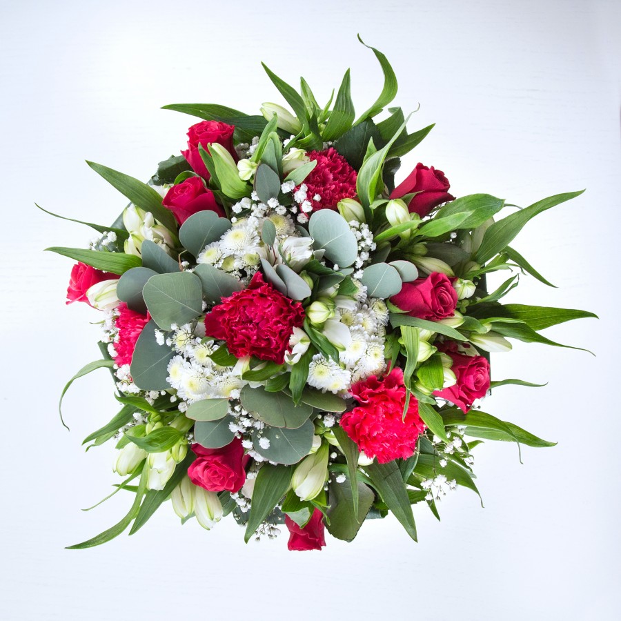 Discover the unique charm of our flower arrangement, featuring a vibrant mix of white chrysanthemums, airy gypsophila, luxurious red roses, cheerful carnations, pristine white alstroemeria, and lush aspidistra leaves. Each bloom is hand-selected for exceptional freshness and quality.