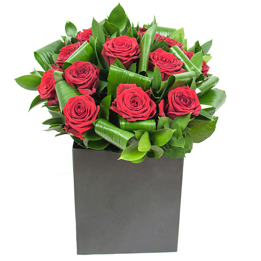 Immerse yourself in the exquisite elegance of our floral masterpiece, where passionate red roses meet the delicate touch of aspidistra leaves and ruscus. This bouquet is crafted for those who appreciate the finer things in life and desire a gift that radiates sophistication and personal warmth.