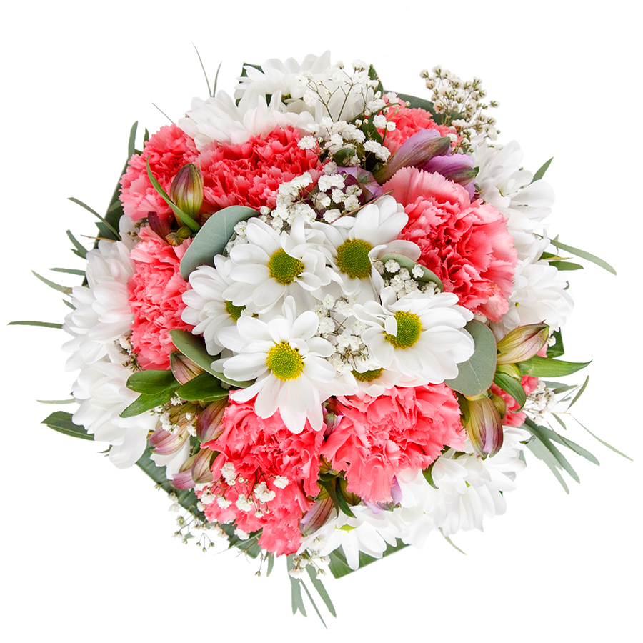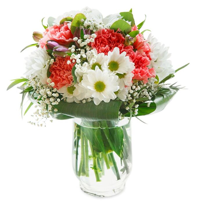 Enchant someone special with our luxurious flower arrangement. This unique bouquet features a stunning combination of white chrysanthemums, delicate gypsophila, soft light pink carnations, and rich aspidistra leaves, orchestrated to perfection.